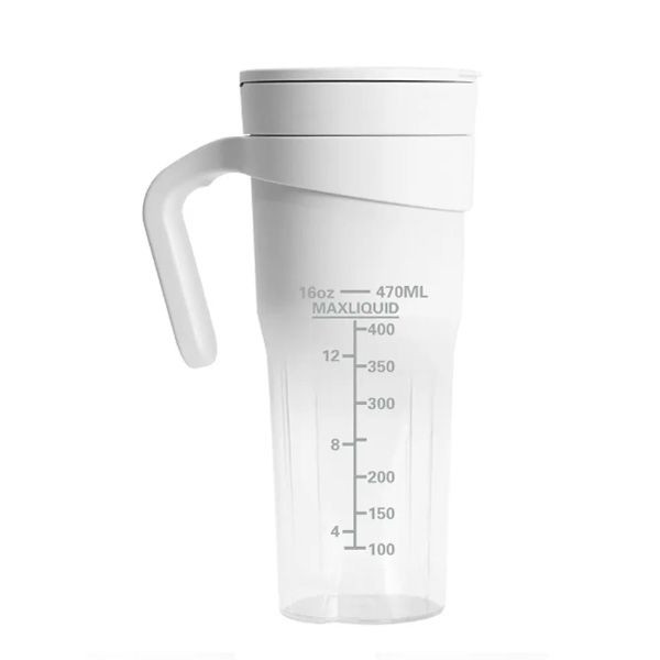 - بدنه شفاف با نشانگر حجم: امکان اندازهگیری دقیق مواد تا 470 میلیلیتر، مناسب برای اسموتی، شیک پروتئین، یا نوشیدنیهای ترکیبی.